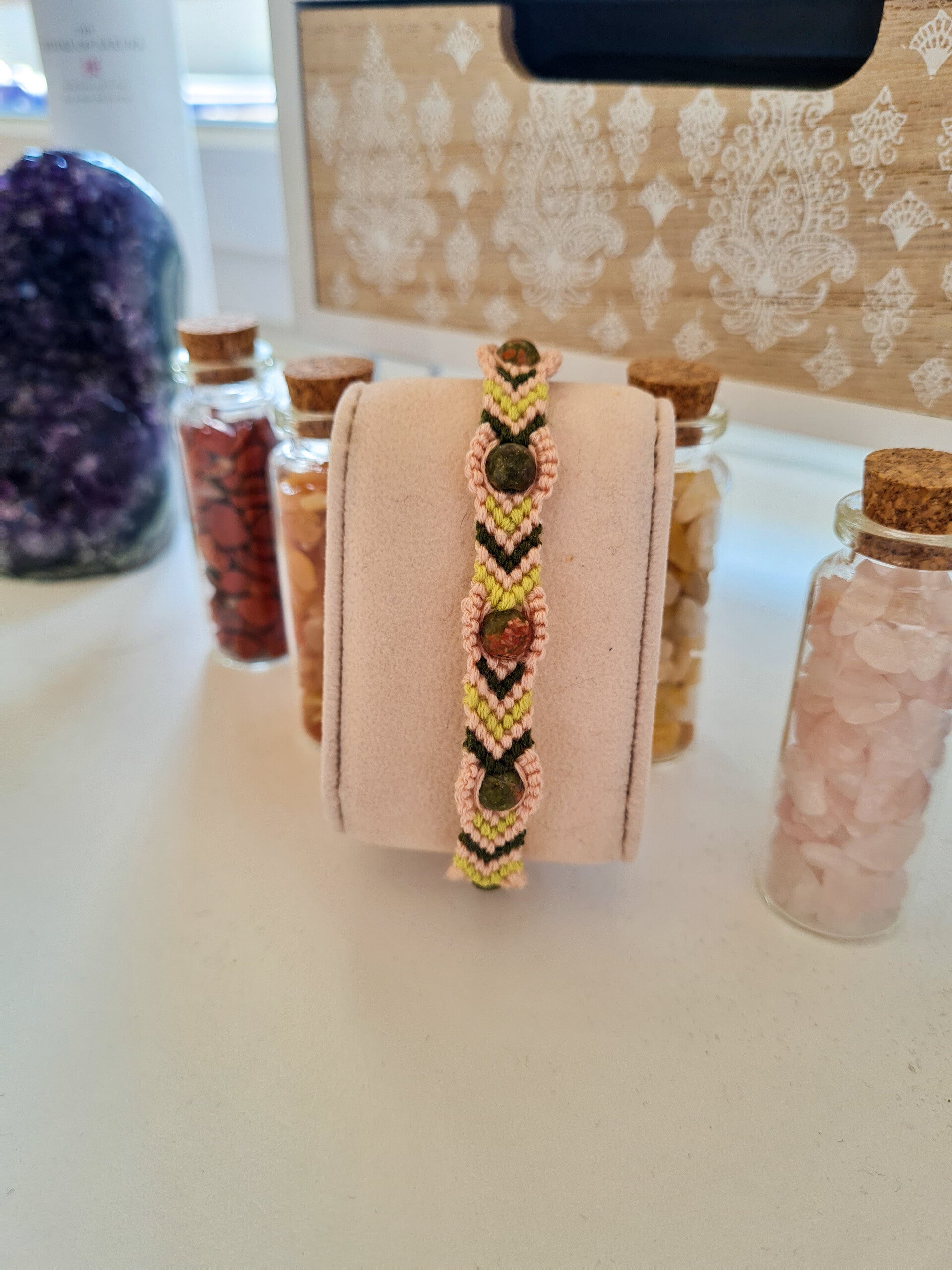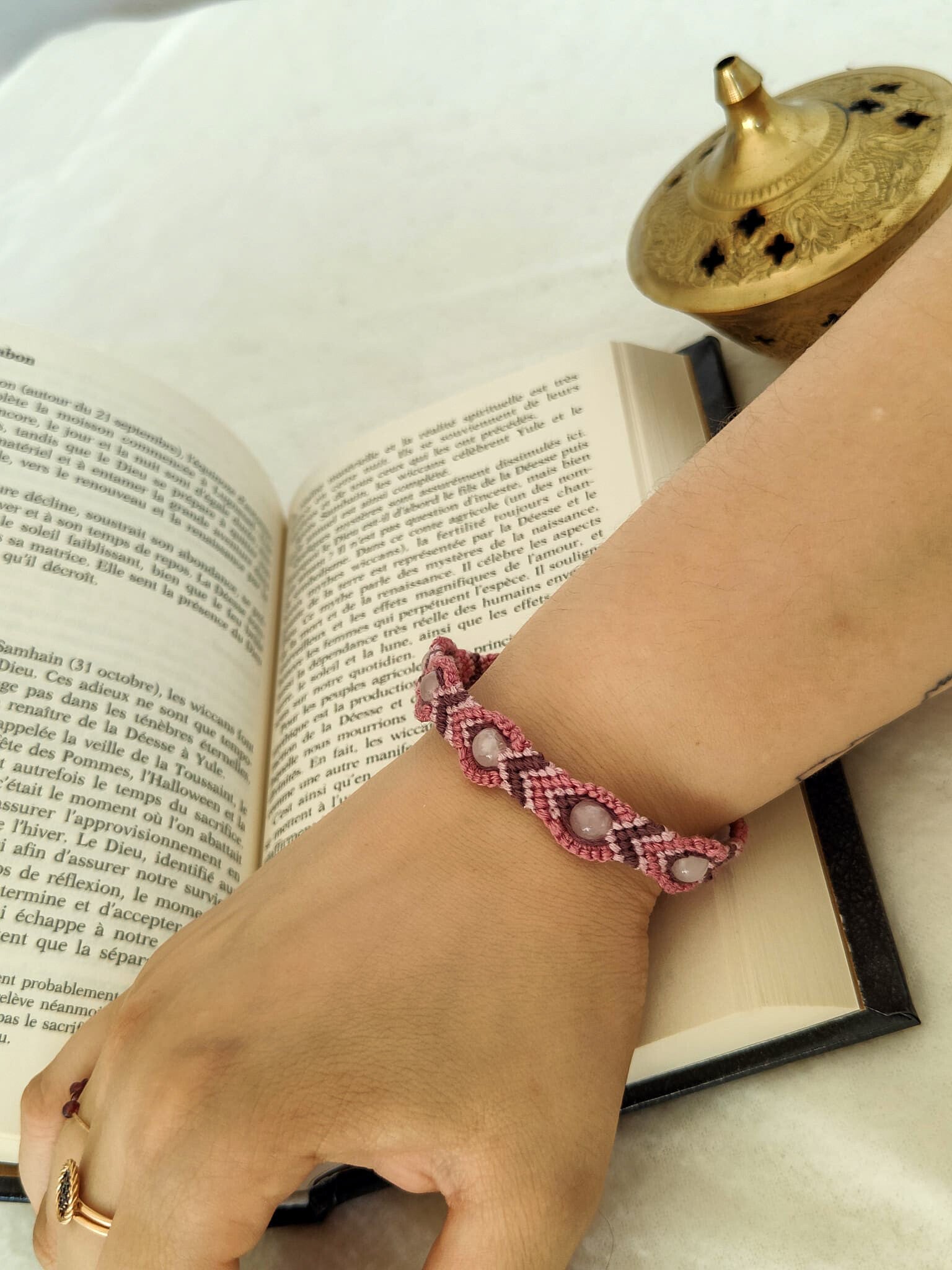 Ce type de bracelet est fait main, avec du fil de coton et un fermoir en acier inoxydable, qui permet d'adapter la taille du bracelet à votre poignet. Vous pouvez y mettre une ou plusieurs sortes de pierres, selon votre besoin.